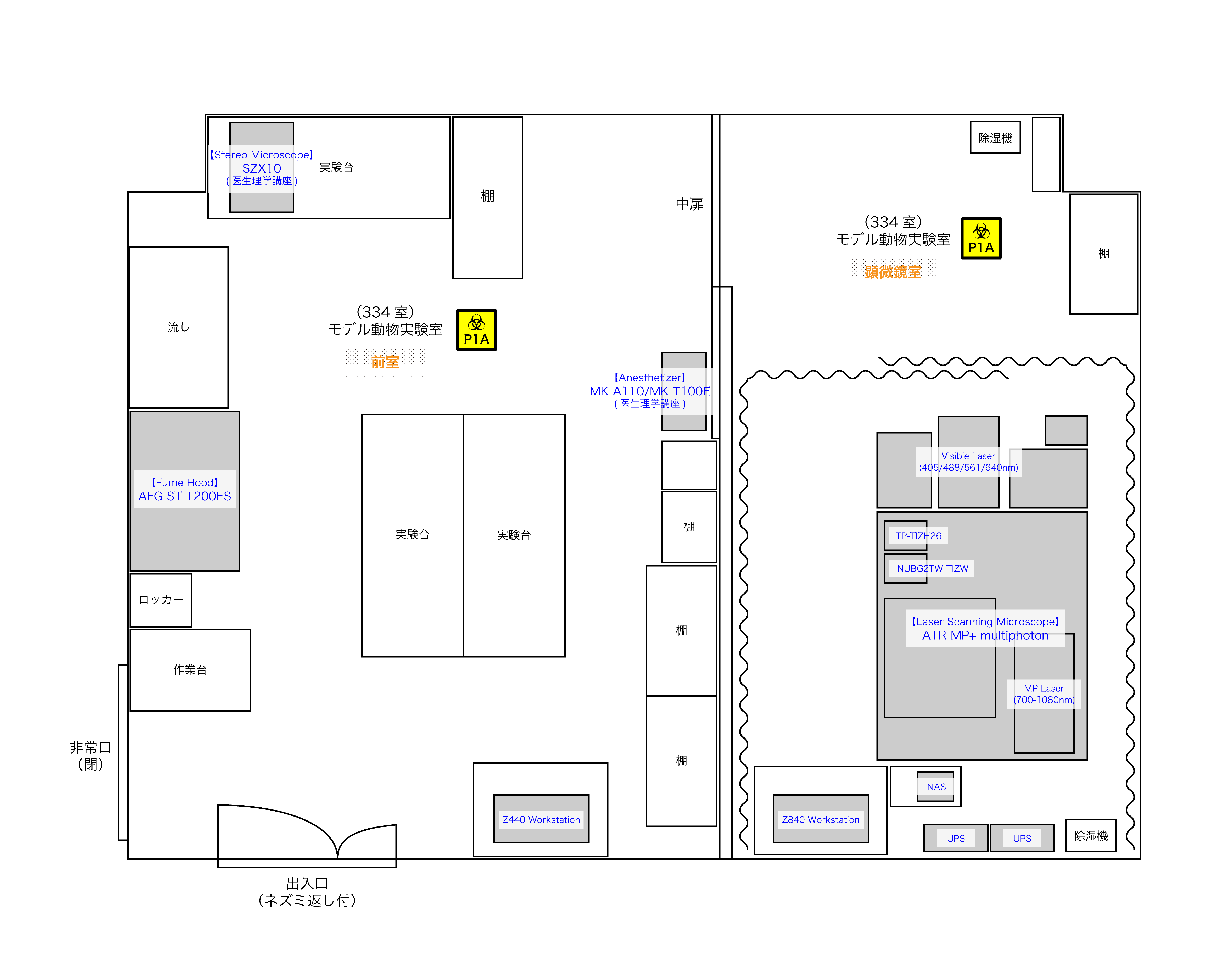 前室に設置の「麻酔器と実体顕微鏡」は医生理学講座の管理物品です。使用については医生理学講座にお問い合わせください。
